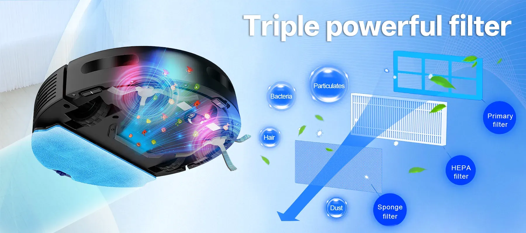 Tired of lingering dirt? 3000Pa Hurricane Suction thoroughly cleans dust, hair, and debris hidden deep in crevices and carpets. Say goodbye to repeated cleaning and hello to true cleanliness in just one go!
